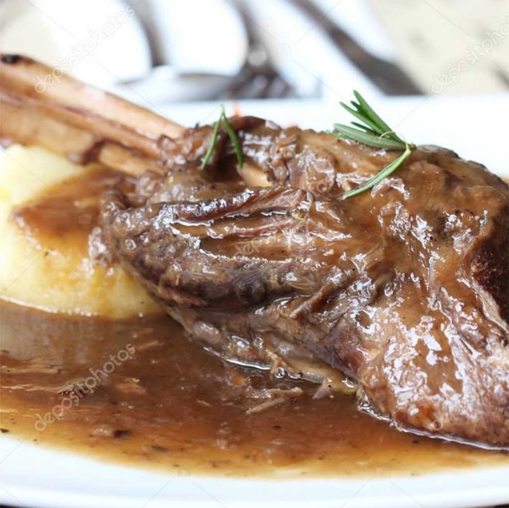 Braised lamb shank slow cooked with carrots and potatoes served with au jus & rice
