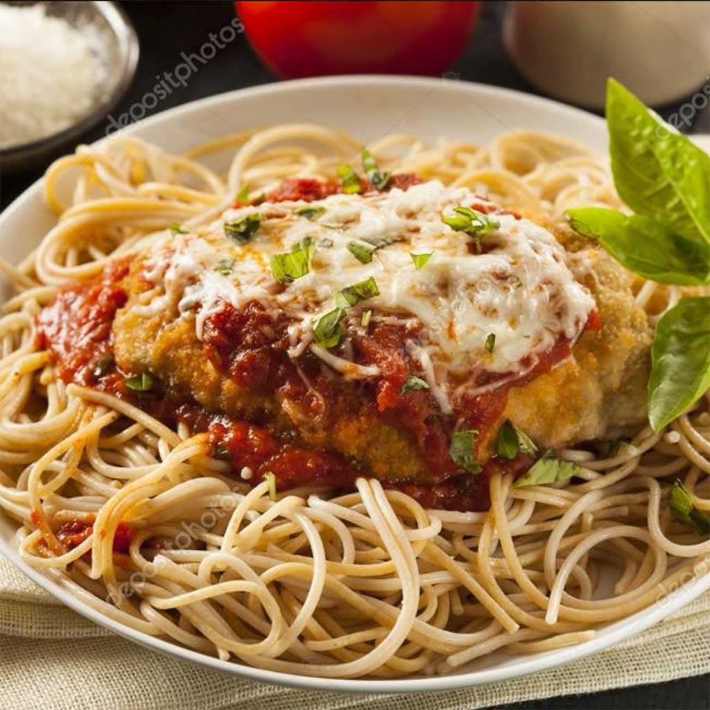 Chicken breast lightly breaded and topped with our zesty tomato sauce, covered with melted mozzarella and parmesan served over linguini.