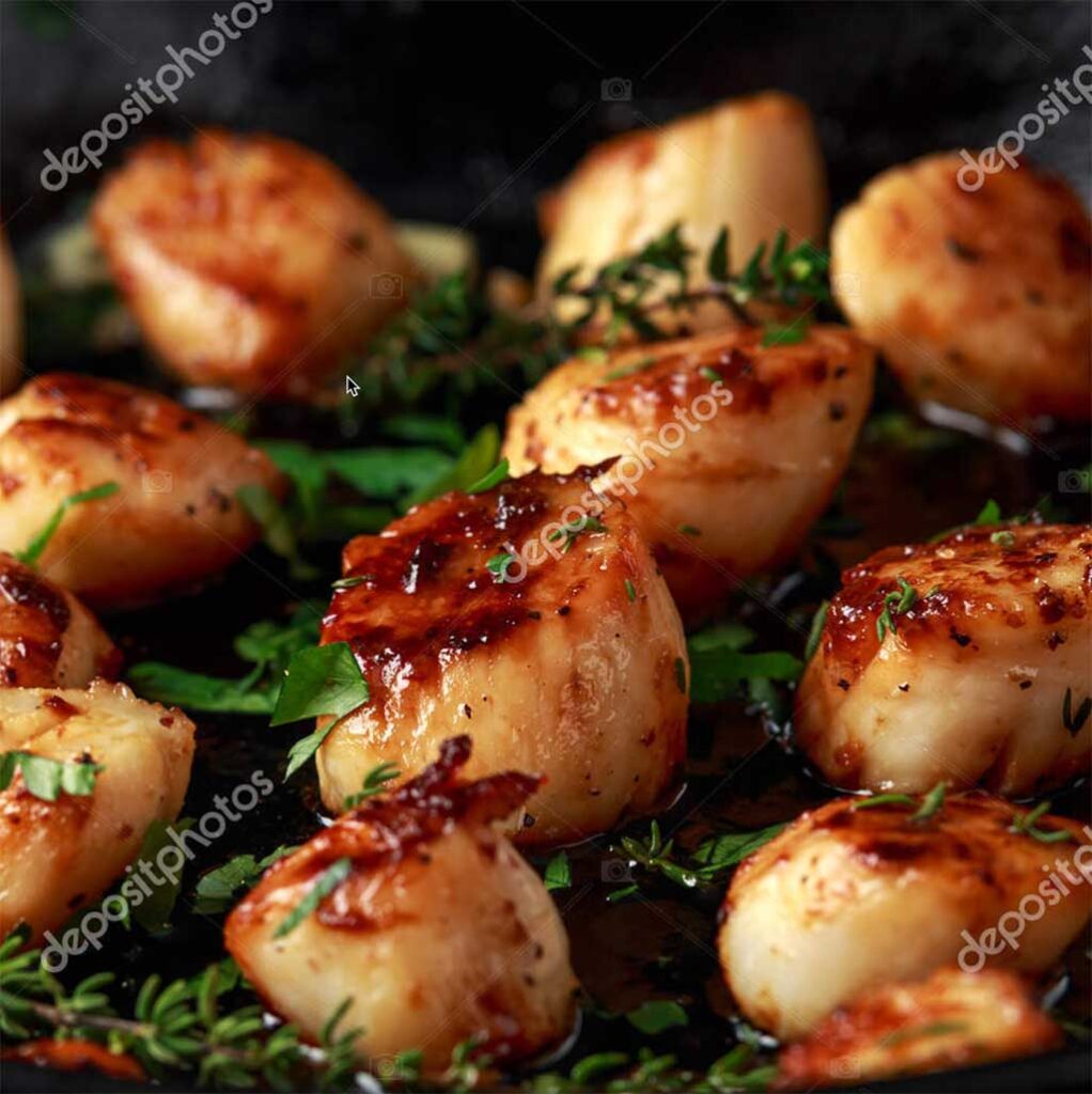 Pan seared scallops with prosciutto, fresh sage, and cherry tomatoes in a white wine lemon butter garlic sauce over linguini